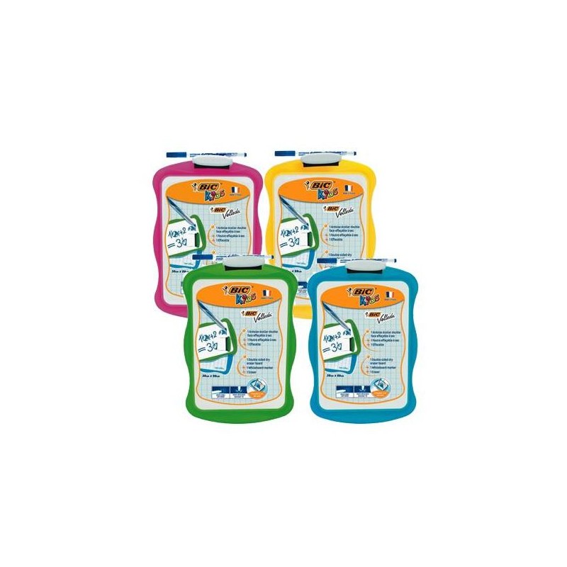Cette ardoise BIC Kids Velleda biface est parfaite pour apprendre à écrire : elle possède 1 face blanche et 1 face quadrillée. Un bon écolier est toujours bien équipé : l’ardoise est fournie avec 1 marqueur bleu et 1 effacette qui se clipe à l’ardoise. Bien pratique pour l’école, son petit format 20 x 30 cm se glisse dans tous les cartables. Disponible en 4 couleurs assorties : bleu, orange, vert, et rose. Attention : coloris assortis, vous recevez de manière aléatoire l’une de ces quatre couleurs. Lot de 1.